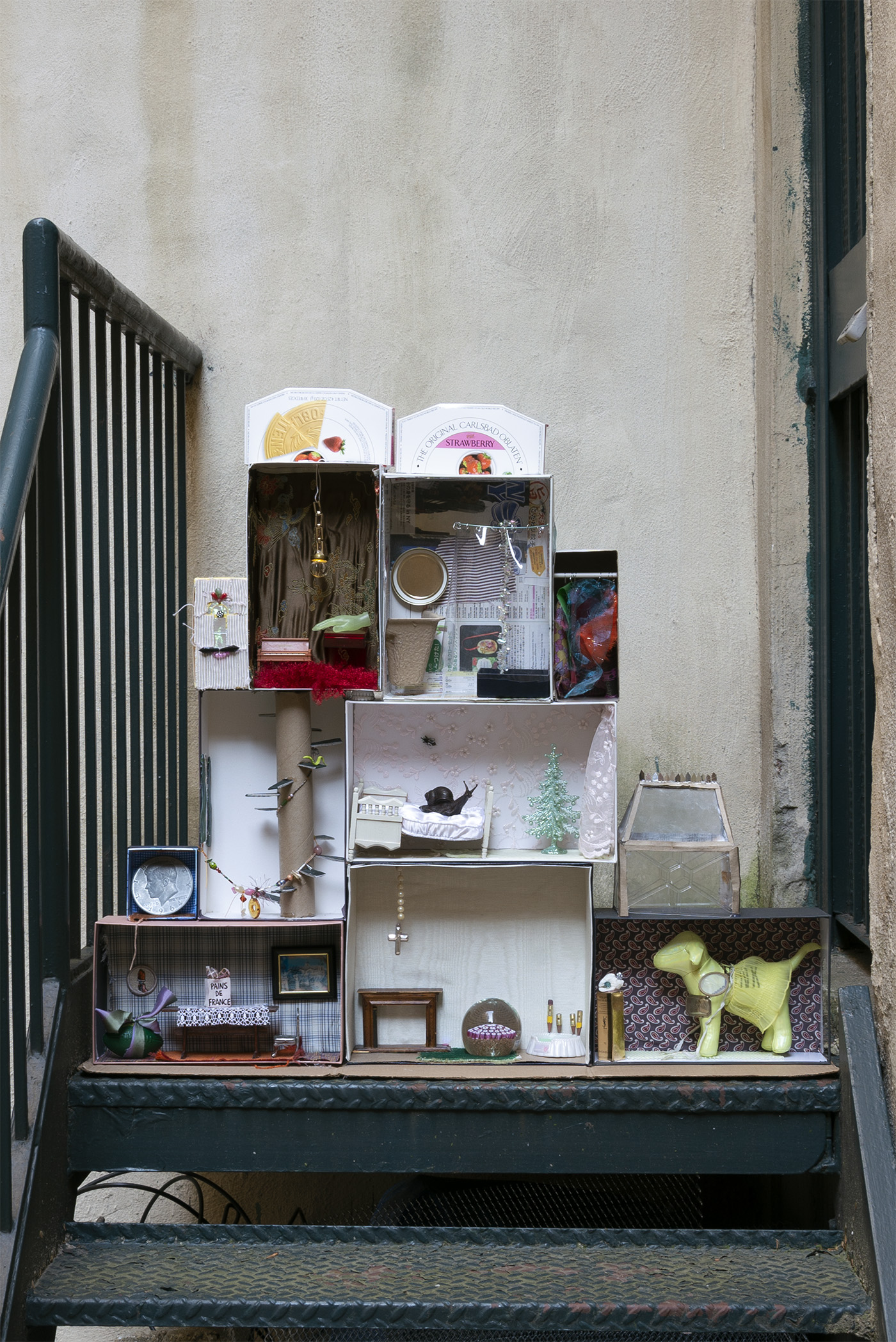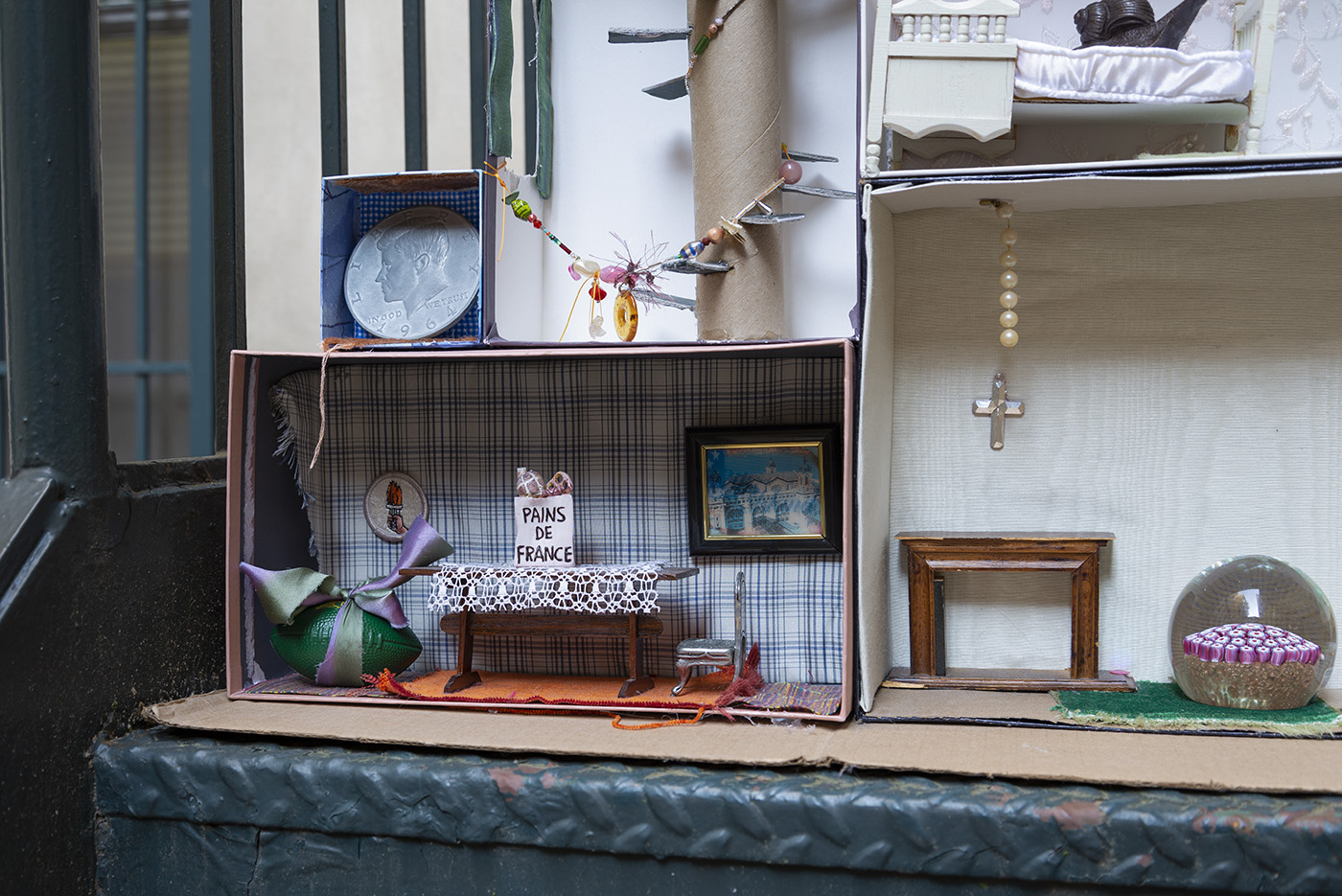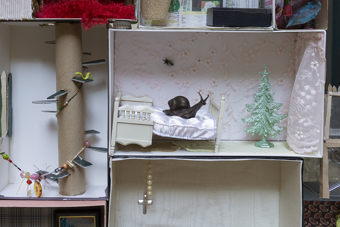 Paperboard, cardboard, various fabrics, newsprint, plastic containers, mohair, wire, brass chain, glass drawer knob, LED battery-powered light, acrylic box, rubber finger puppet, miniature piano, metal jar lid, gauge vinyl, plastic beads, metal jumprings, shoe-shape rod, sequins, metal bottle caps, plastic Christmas tree ornament, brass snail, miniature mattress, antique miniature wooden furniture, miniature rubber snake, novelty oversized Kennedy half dollar coin, embroidered patch, New York Jets squishy souvenir toy, dyed silk ribbon, miniature bread bag, miniature metal chair, Ellis Island lenticular souvenir, pearls, KB Imports Murano glass paperweight, No. 2 pencils, miniature plastic dog bed, seashell, antique whiskey bottle name plate, antique miniature tennis racket, antique doll dress, Victoria's Secret Pink dog toy, lampworked glass fly
