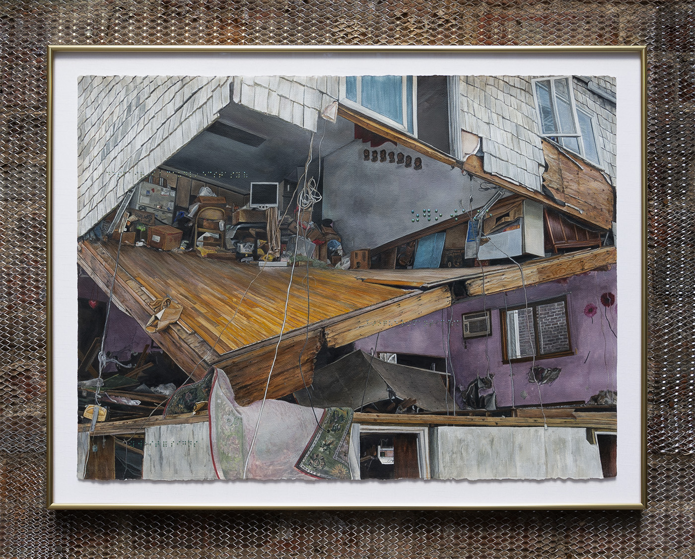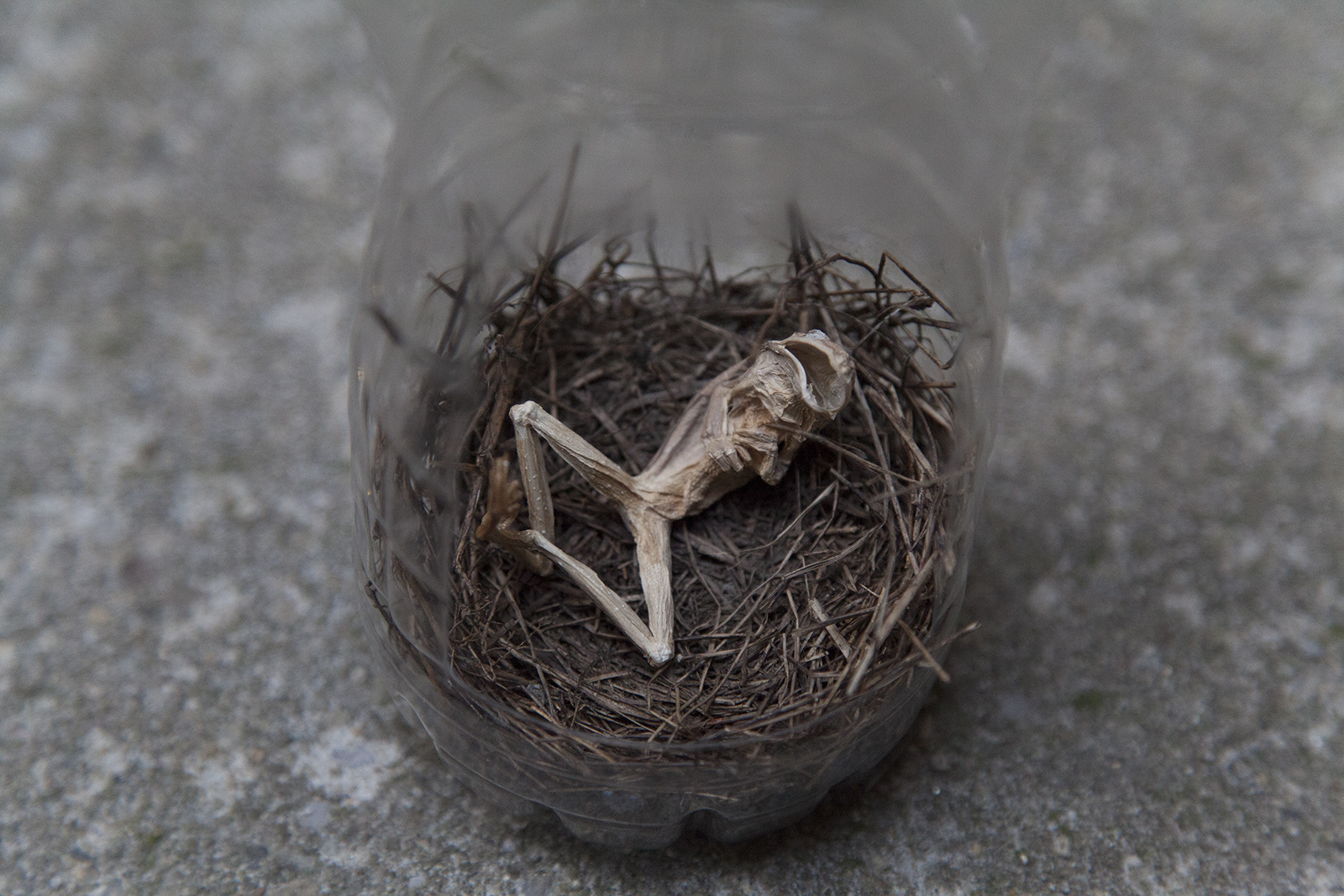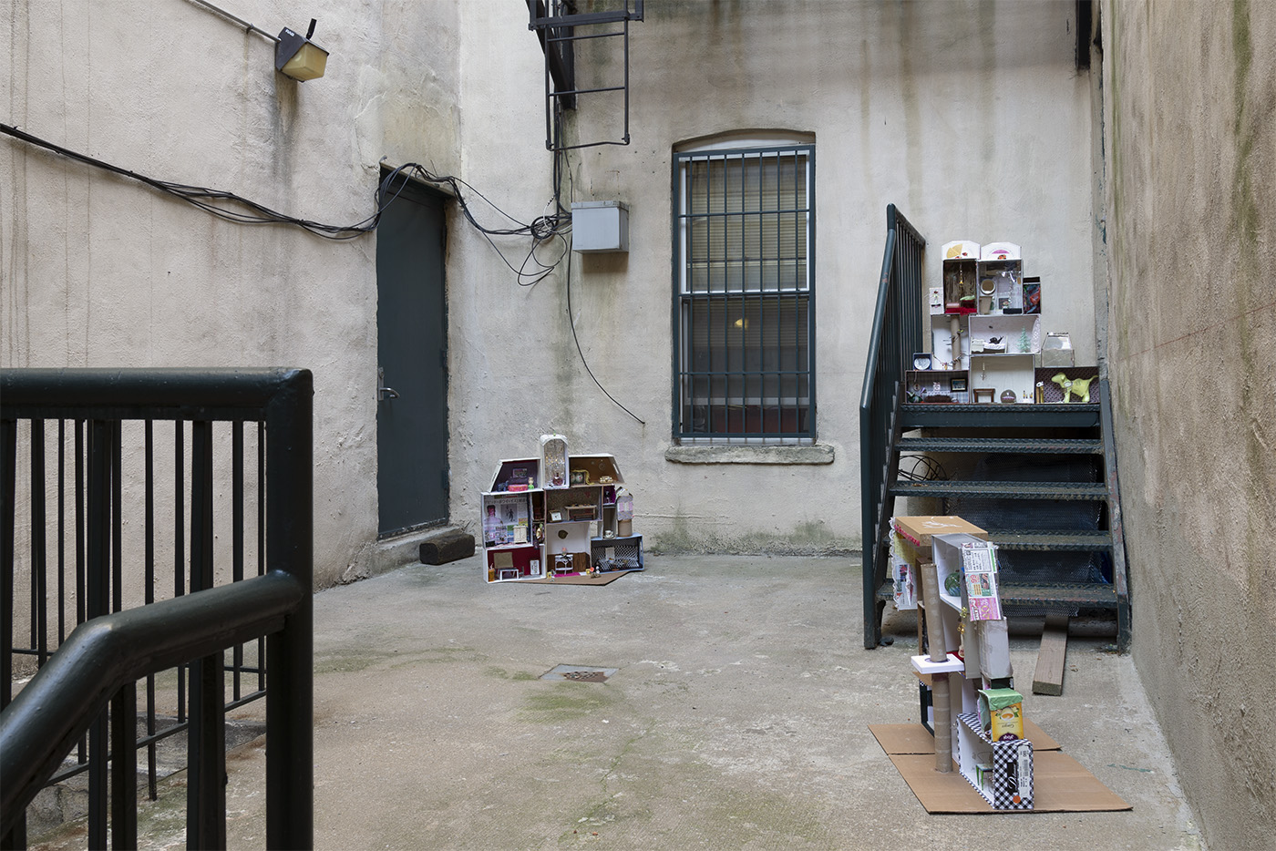 Paperboard, cardboard, various fabrics, newsprint, plastic containers, mohair, wire, brass chain, glass drawer knob, LED battery-powered light, acrylic box, rubber finger puppet, miniature piano, metal jar lid, gauge vinyl, plastic beads, metal jumprings, shoe-shape rod, sequins, metal bottle caps, plastic Christmas tree ornament, brass snail, miniature mattress, antique miniature wooden furniture, miniature rubber snake, novelty oversized Kennedy half dollar coin, embroidered patch, New York Jets squishy souvenir toy, dyed silk ribbon, miniature bread bag, miniature metal chair, Ellis Island lenticular souvenir, pearls, KB Imports Murano glass paperweight, No. 2 pencils, miniature plastic dog bed, seashell, antique whiskey bottle name plate, antique miniature tennis racket, antique doll dress, Victoria's Secret Pink dog toy, lampworked glass fly