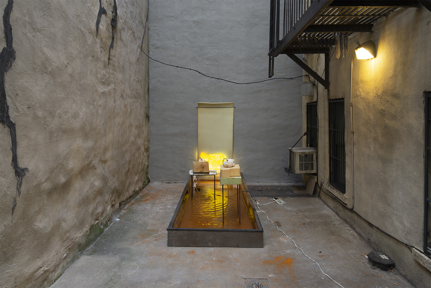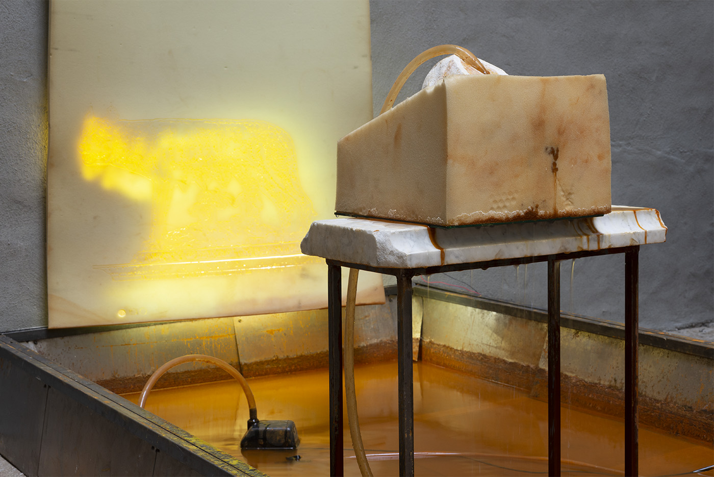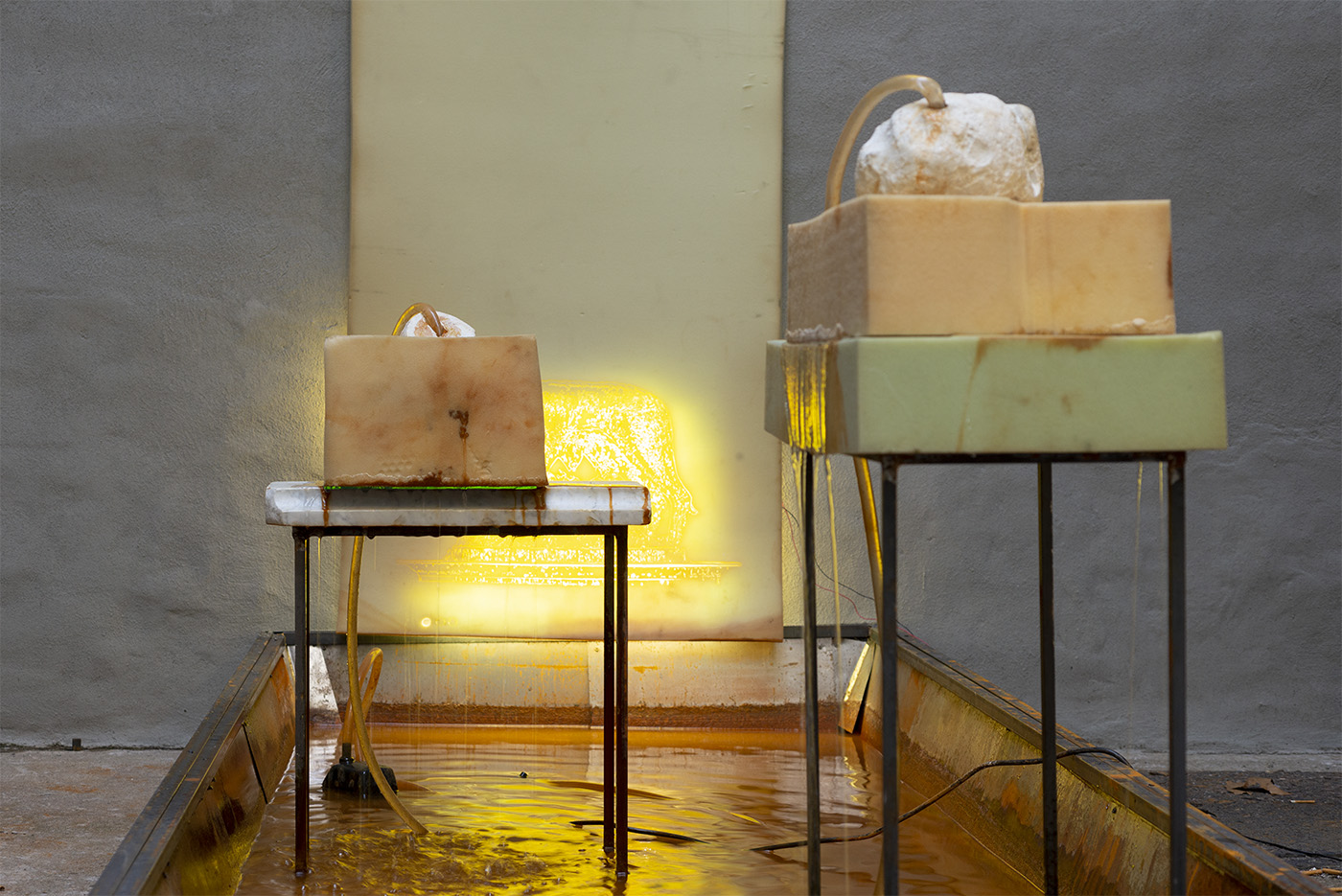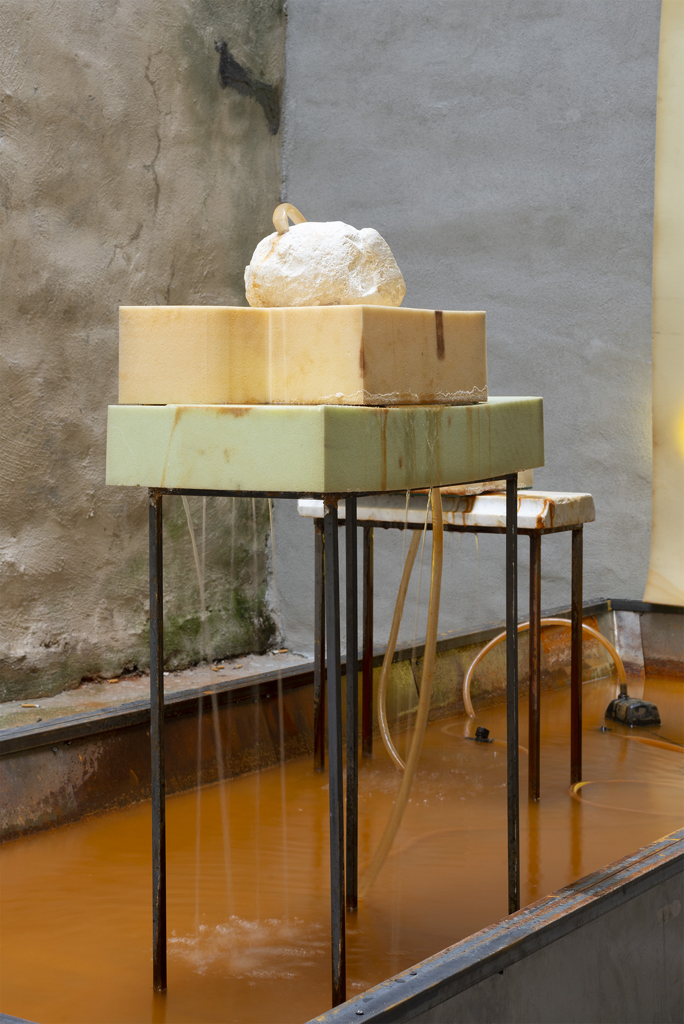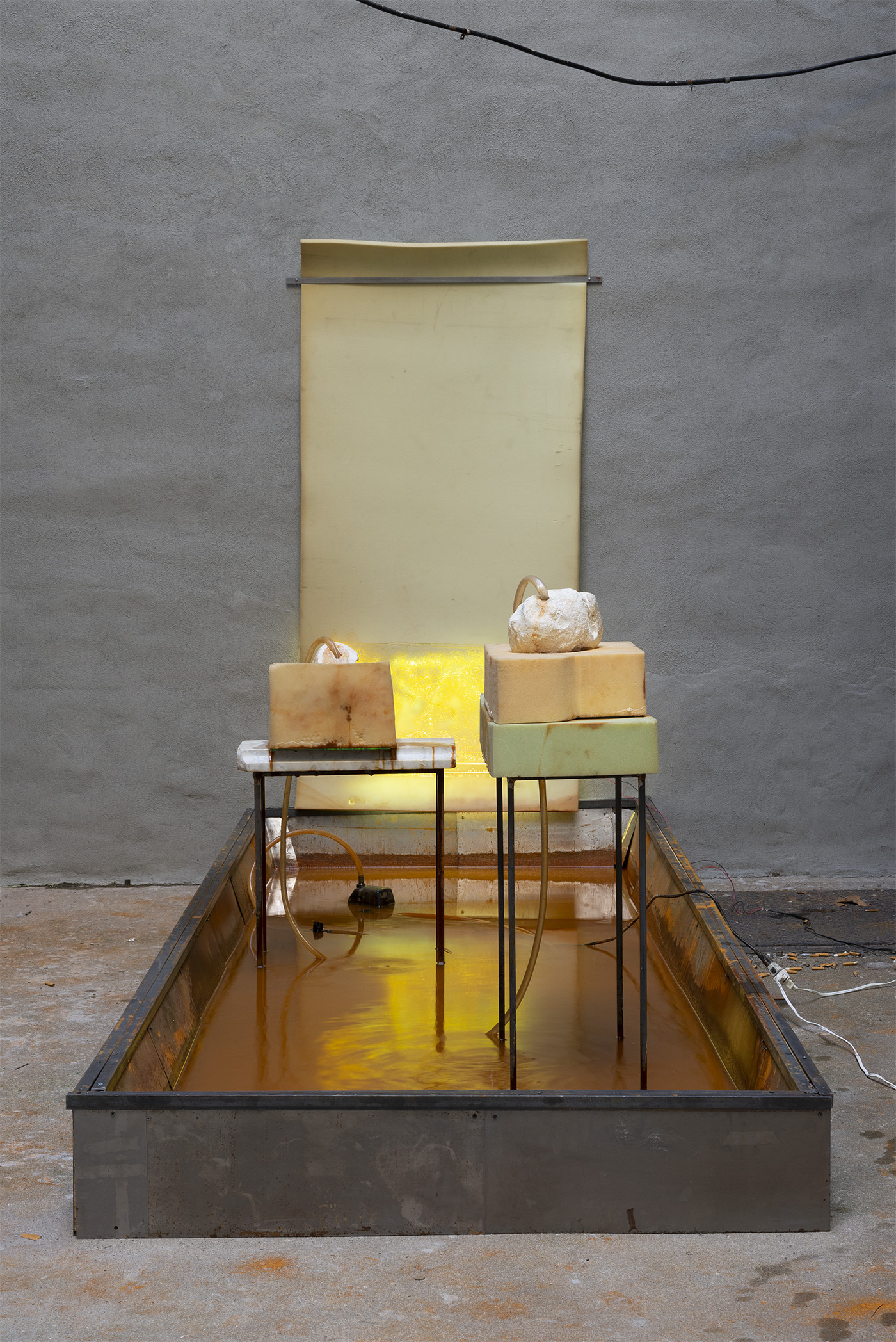 Water, steel, tarp, pump, foam, lights, wires, plastic tubes, glass, wood, marble
