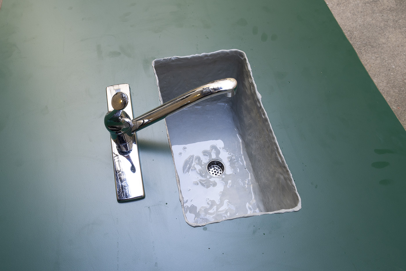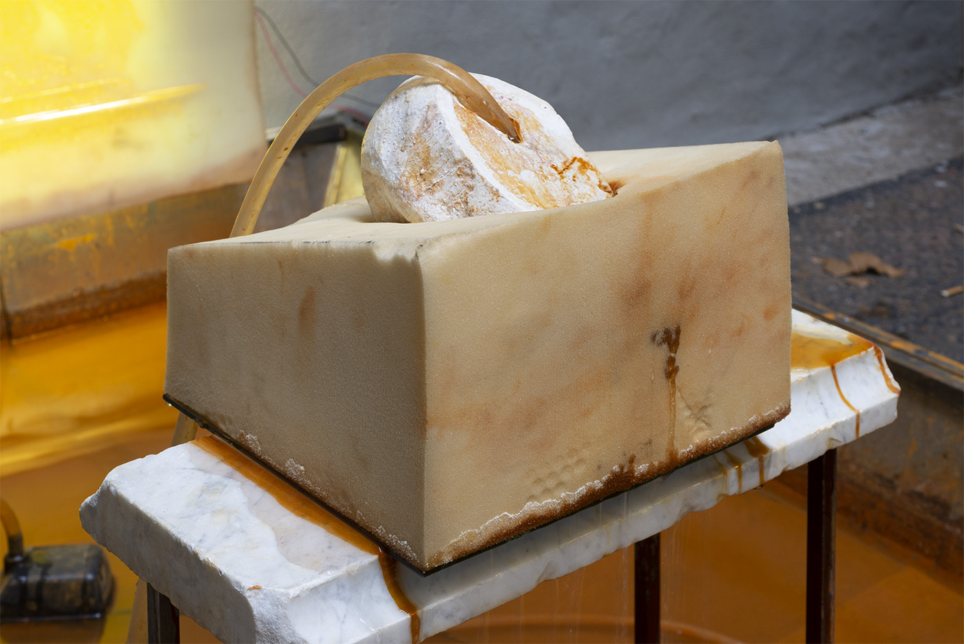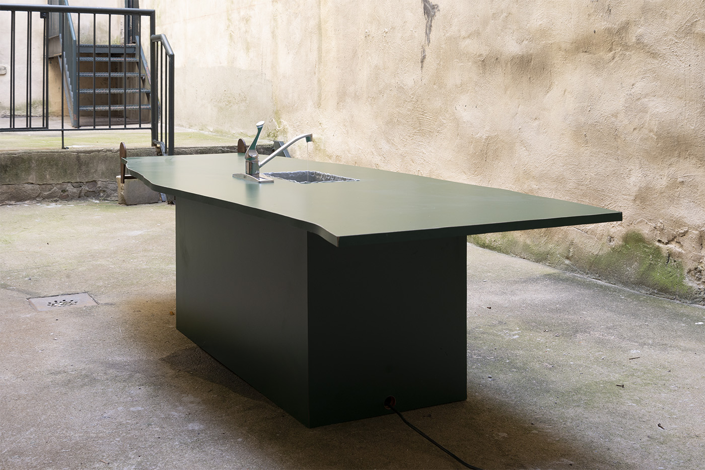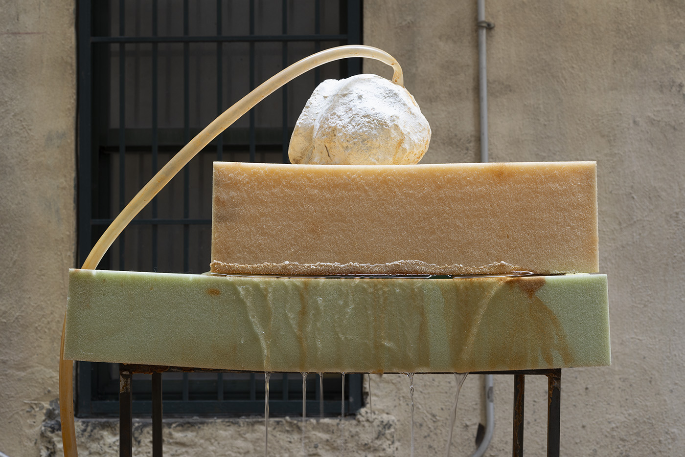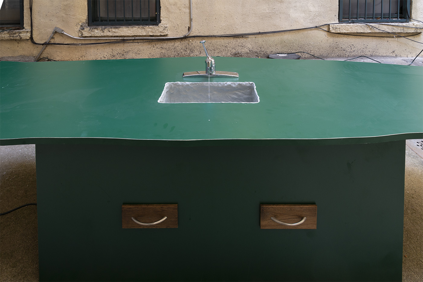 Water, steel, tarp, pump, foam, lights, wires, plastic tubes, glass, wood, marble