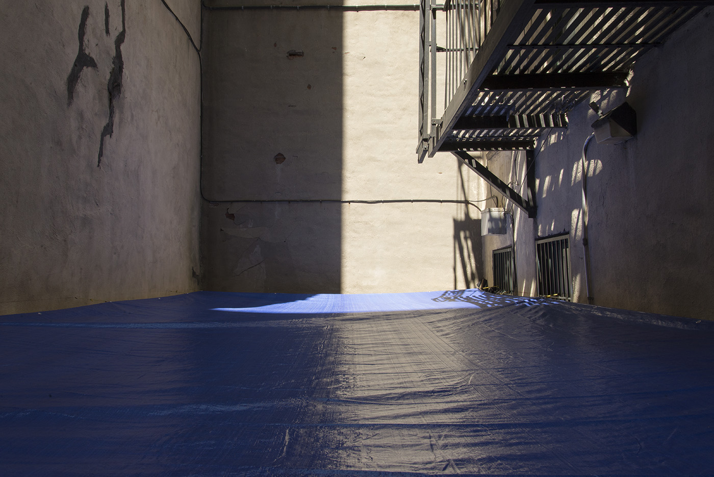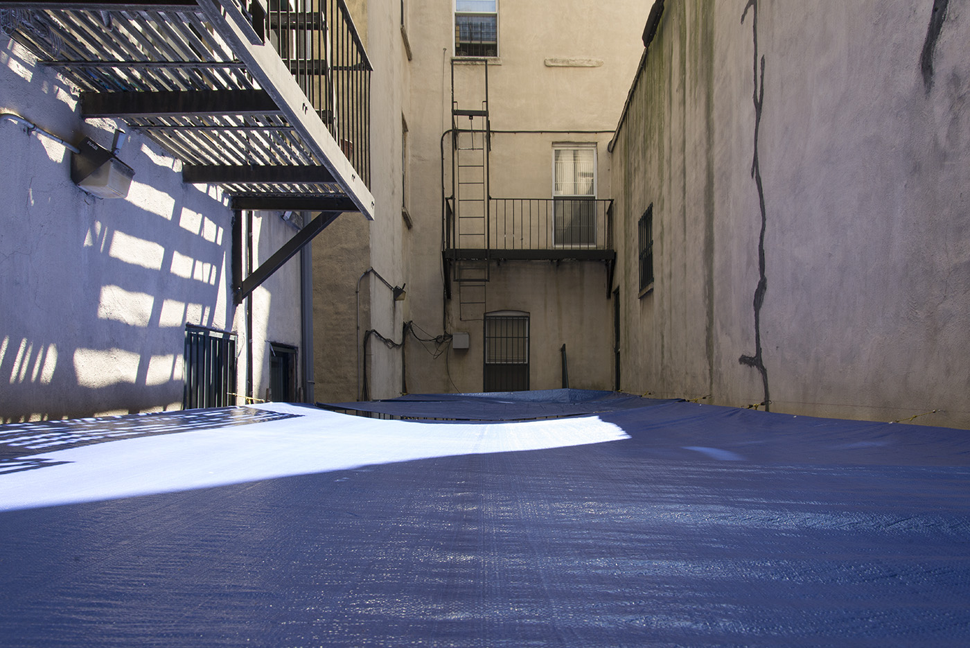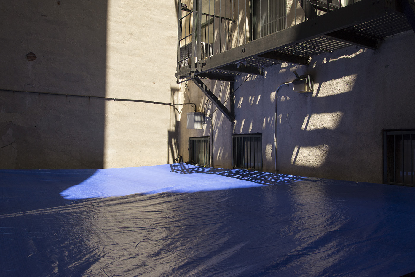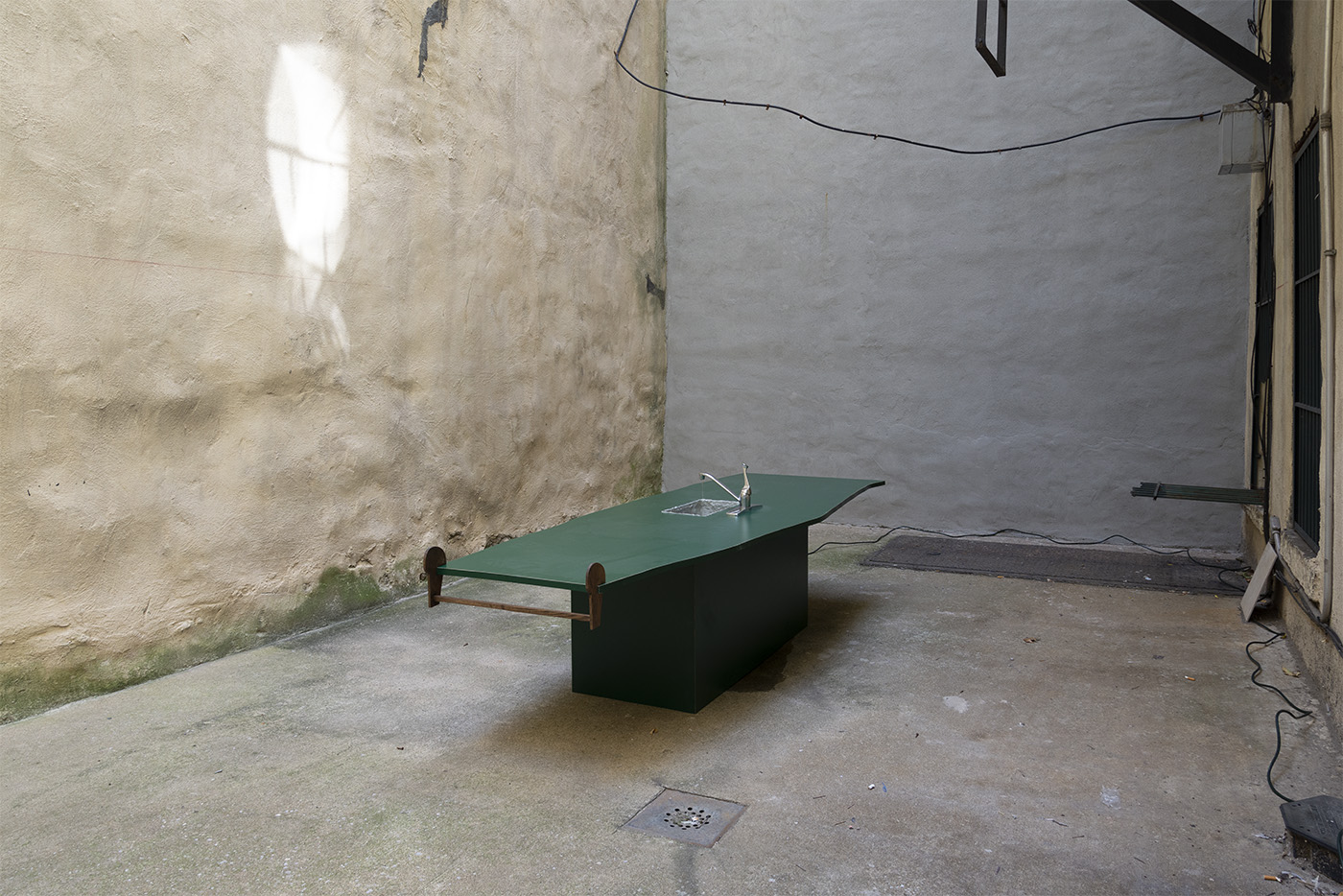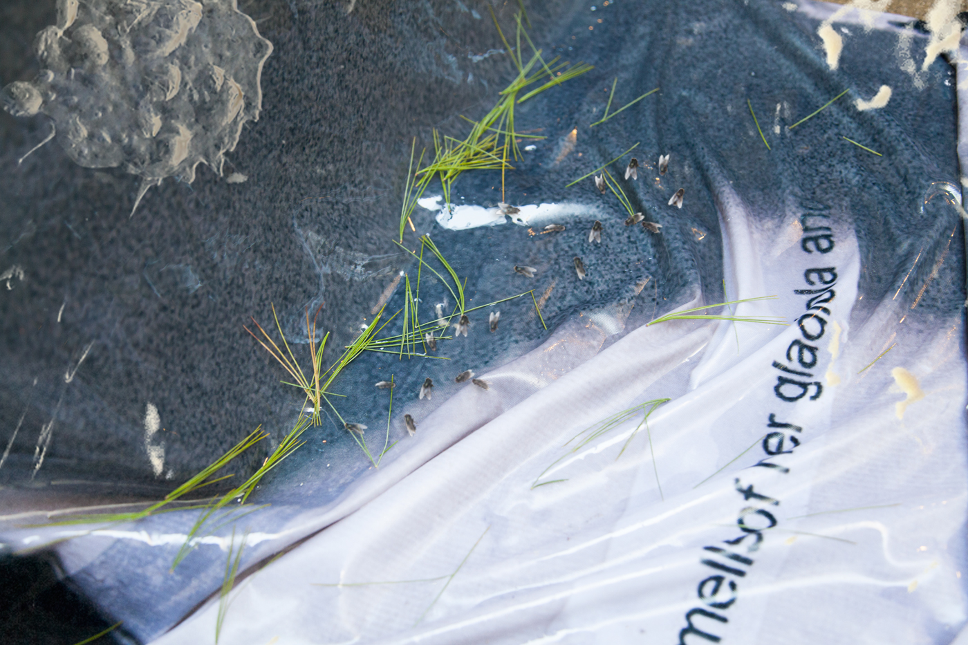 Water, steel, tarp, pump, foam, lights, wires, plastic tubes, glass, wood, marble
