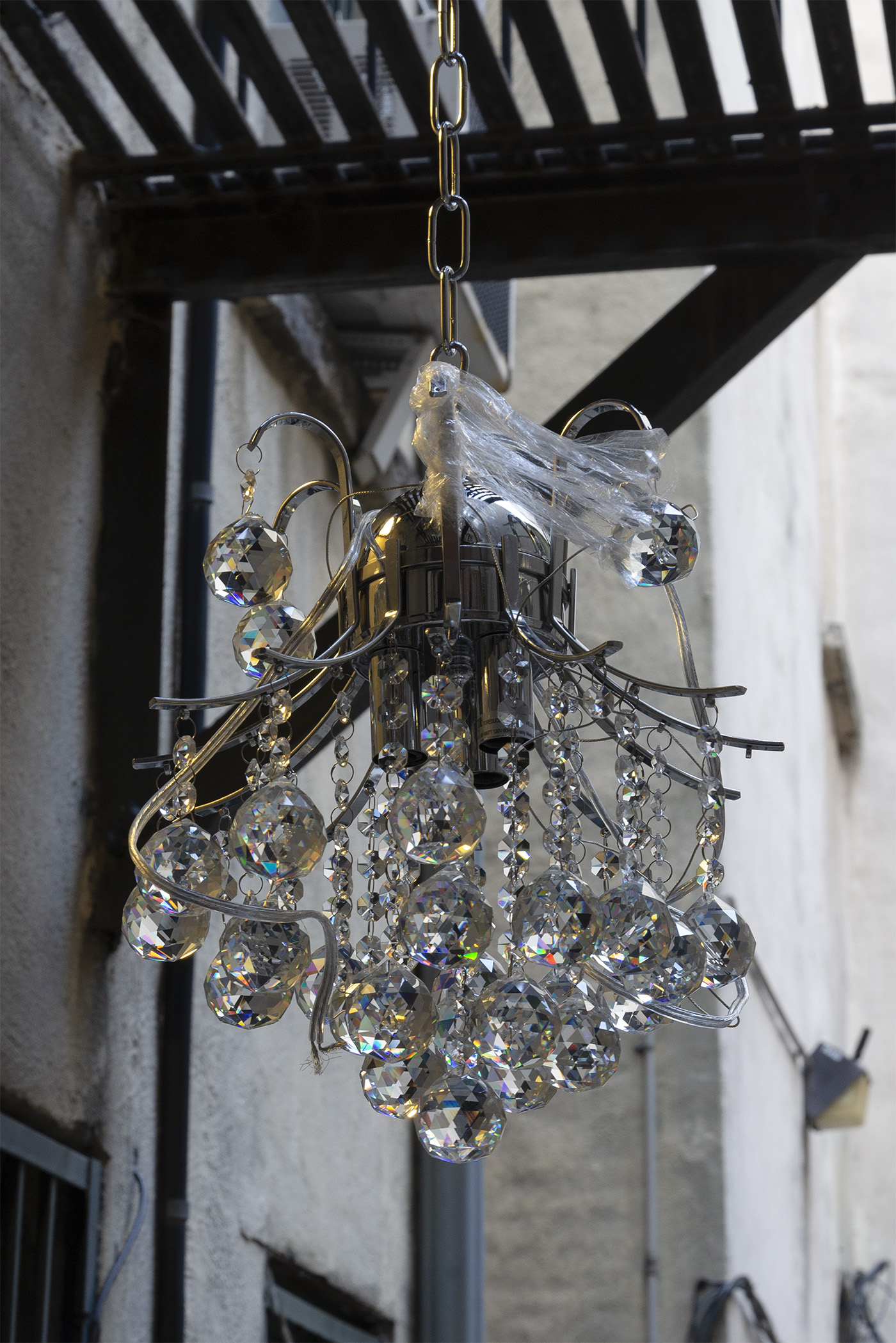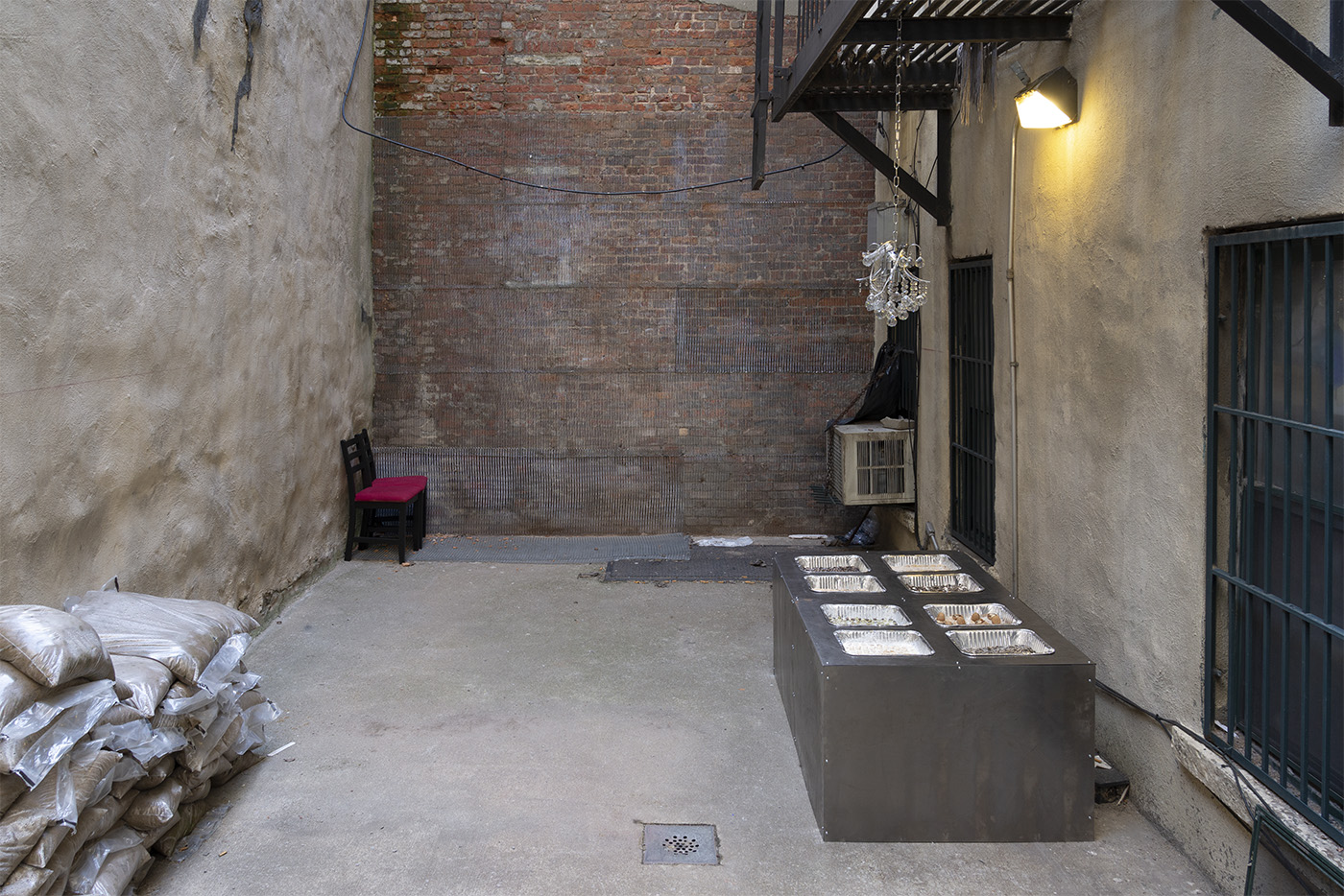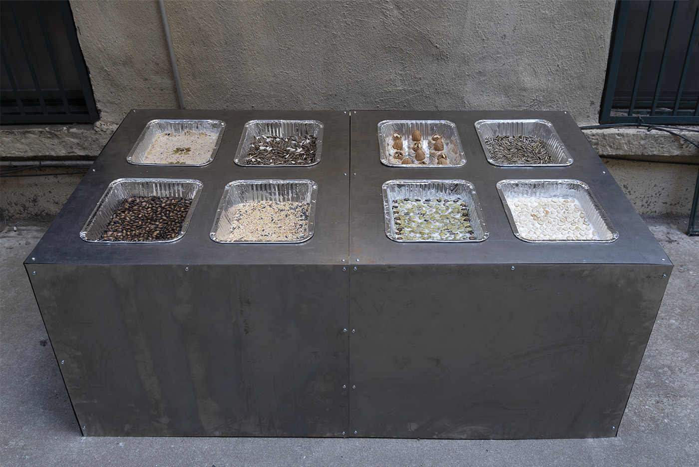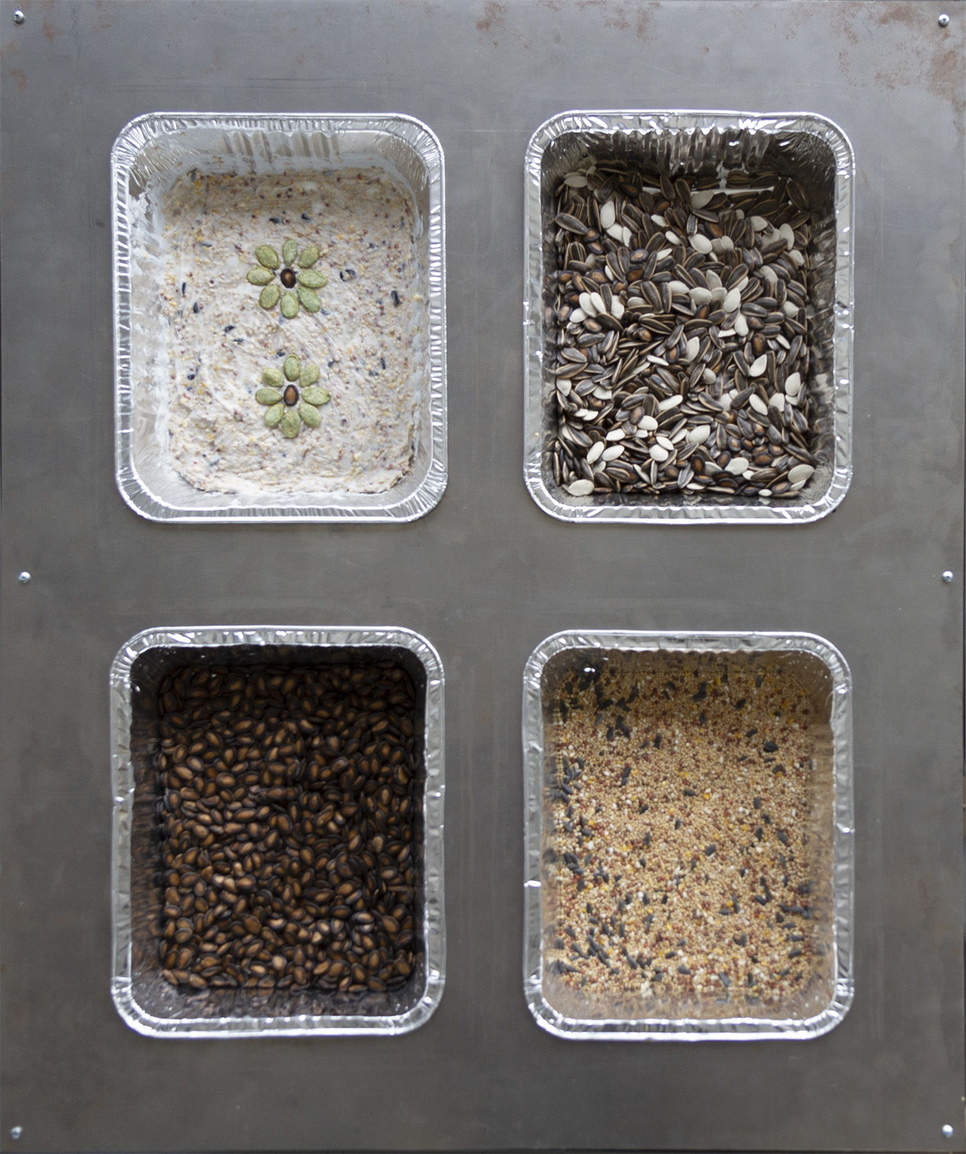 Steel, aluminum, various nut and seed mix, vegetable shortening, chandelier
