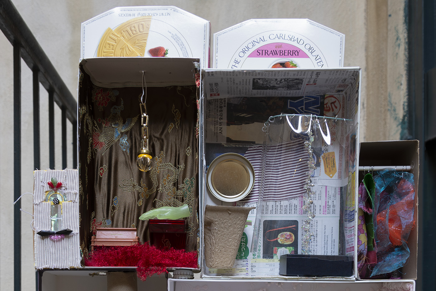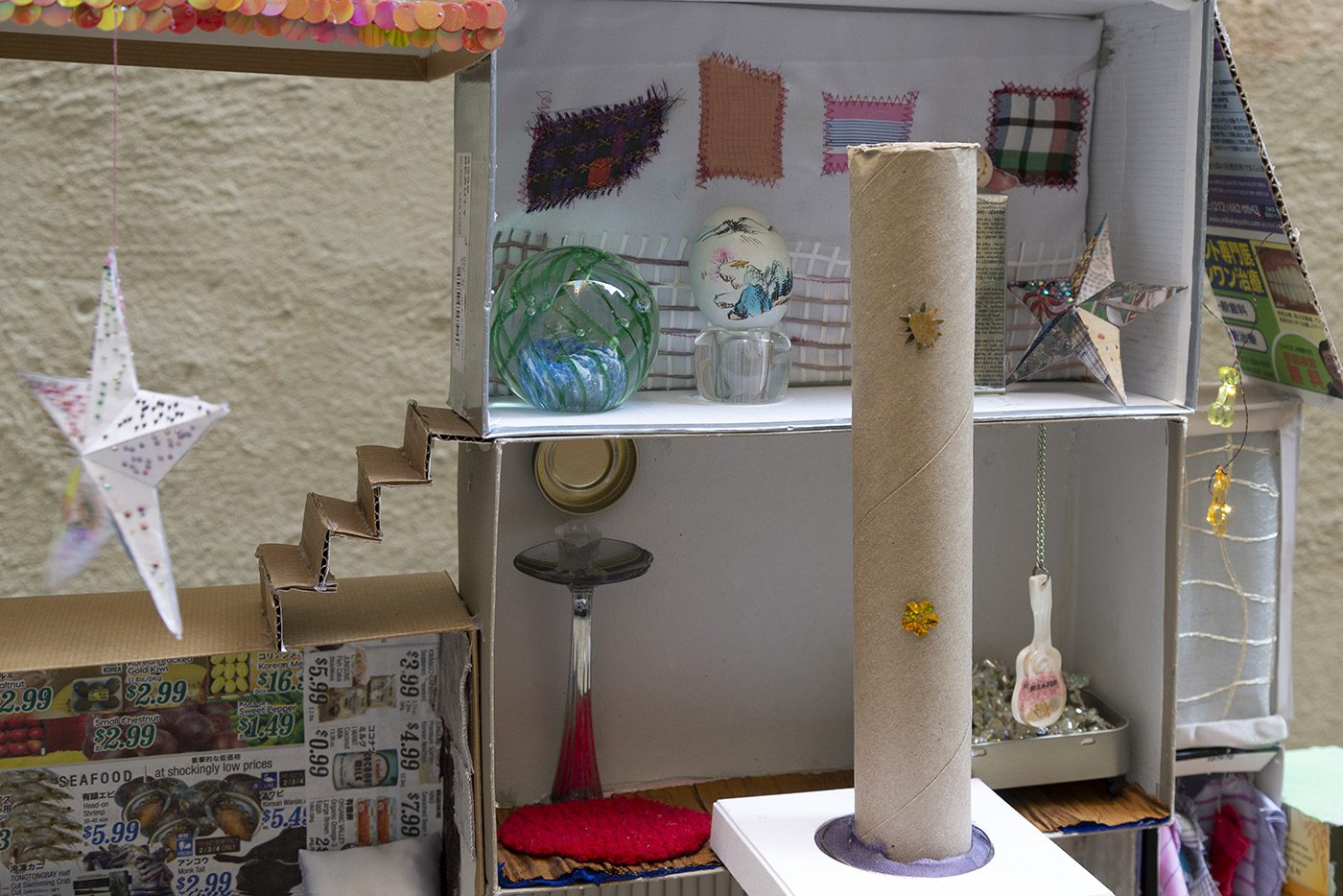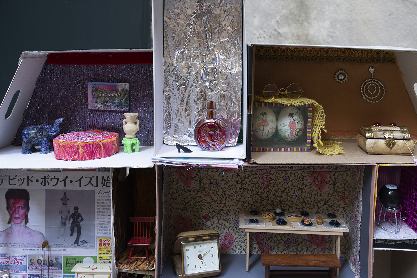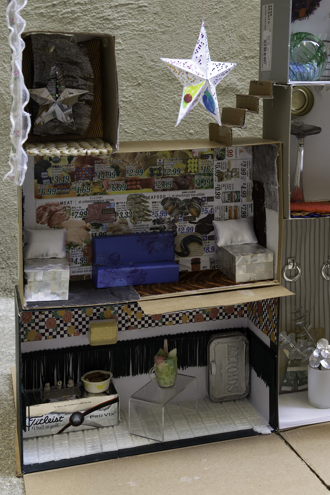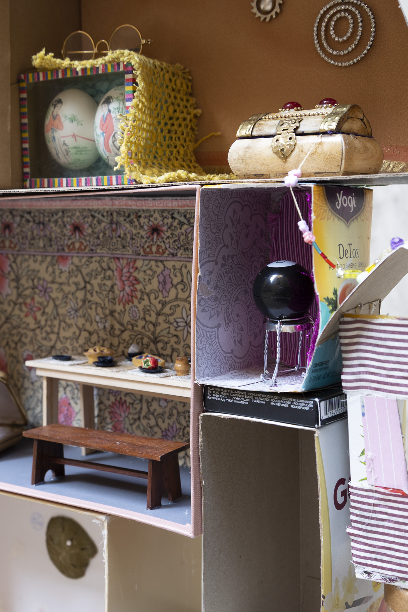 Paperboard, cardboard, various fabrics, newsprint, glass tile, paper stars, rhinestones, sequins, LED battery-powered light, plastic beads, Antique glass paperweight, vinyl patch, Japanese handpainted eggshell, Muji™ glass toothbrush stand, abalone boxes, John Deacons Scottish glass paperweight, resin Bula-Fiji guitar keychain, metal jar lid, plastic spoon, Altoids® tins, miniature ramen bowl, Sculpey, miniature smoothie cup, ornamental faux plant, silver earrings, US dollar bill origami, Urban Decay® by Skindinävia Chill Cooling & Hydrating Setting Spray bottle cap, wire, seashells, shoe-shape rod, antique cat humor magnet, acrylic, foam core