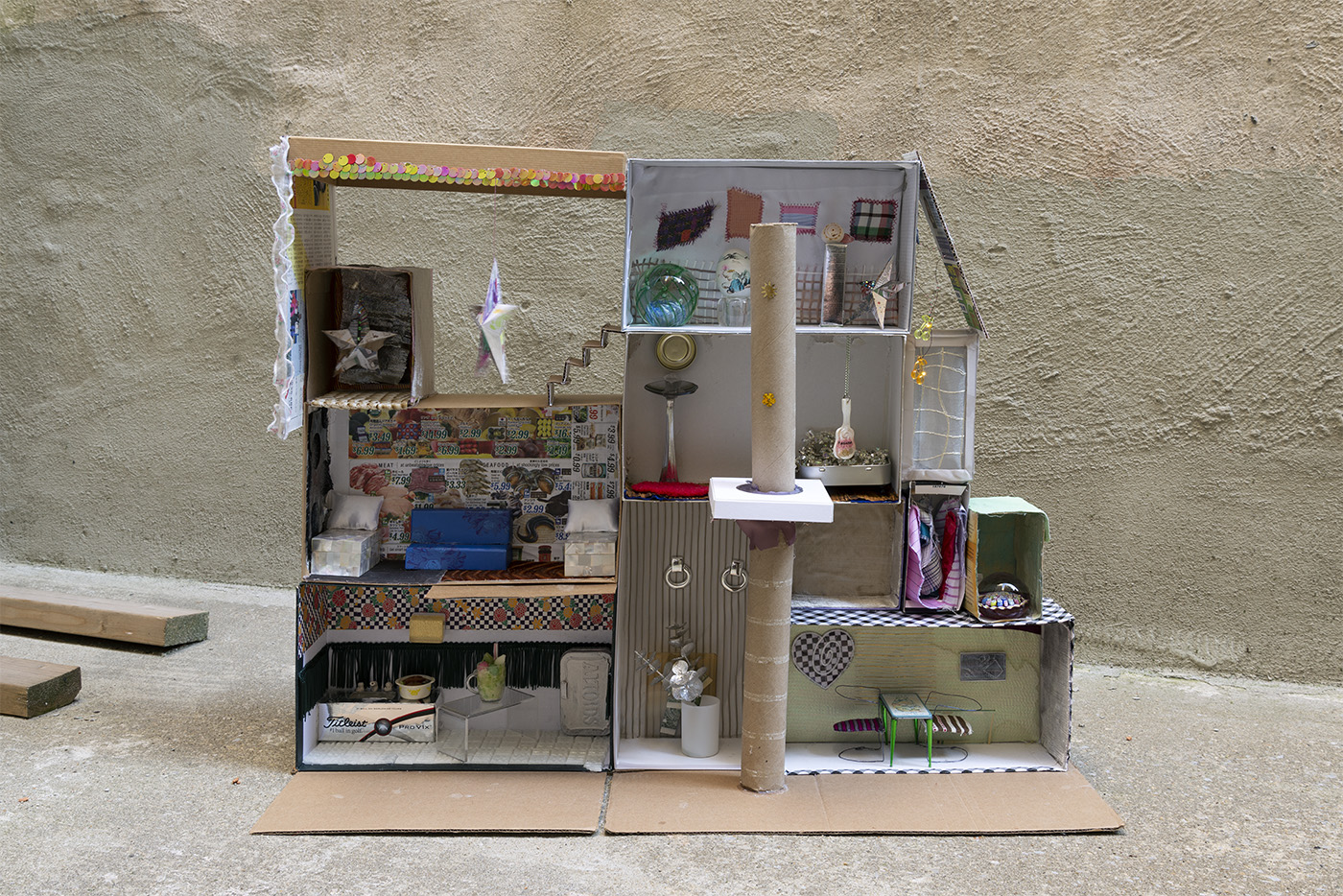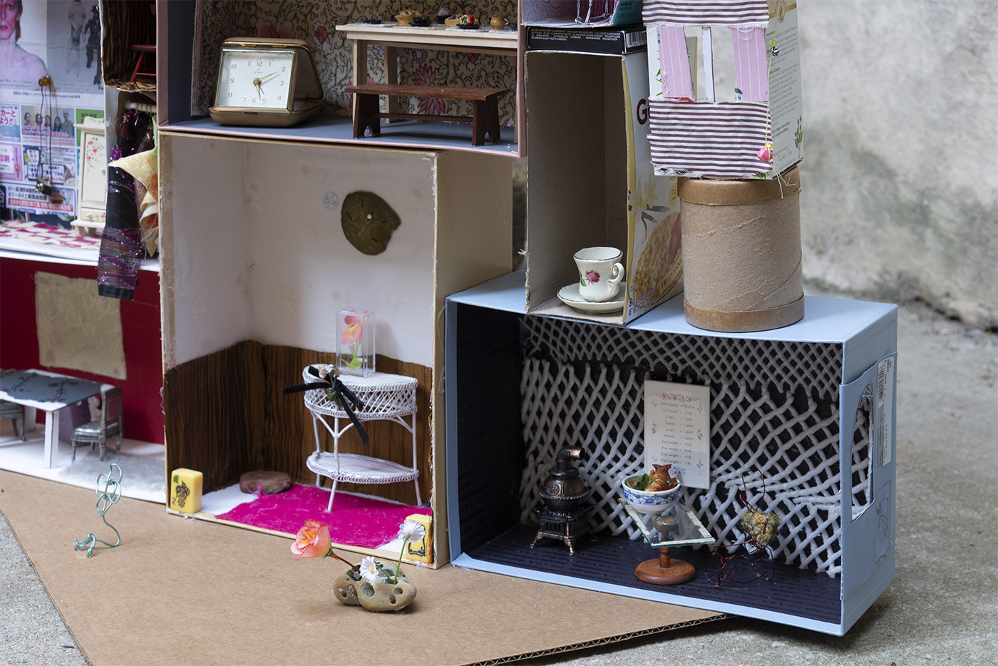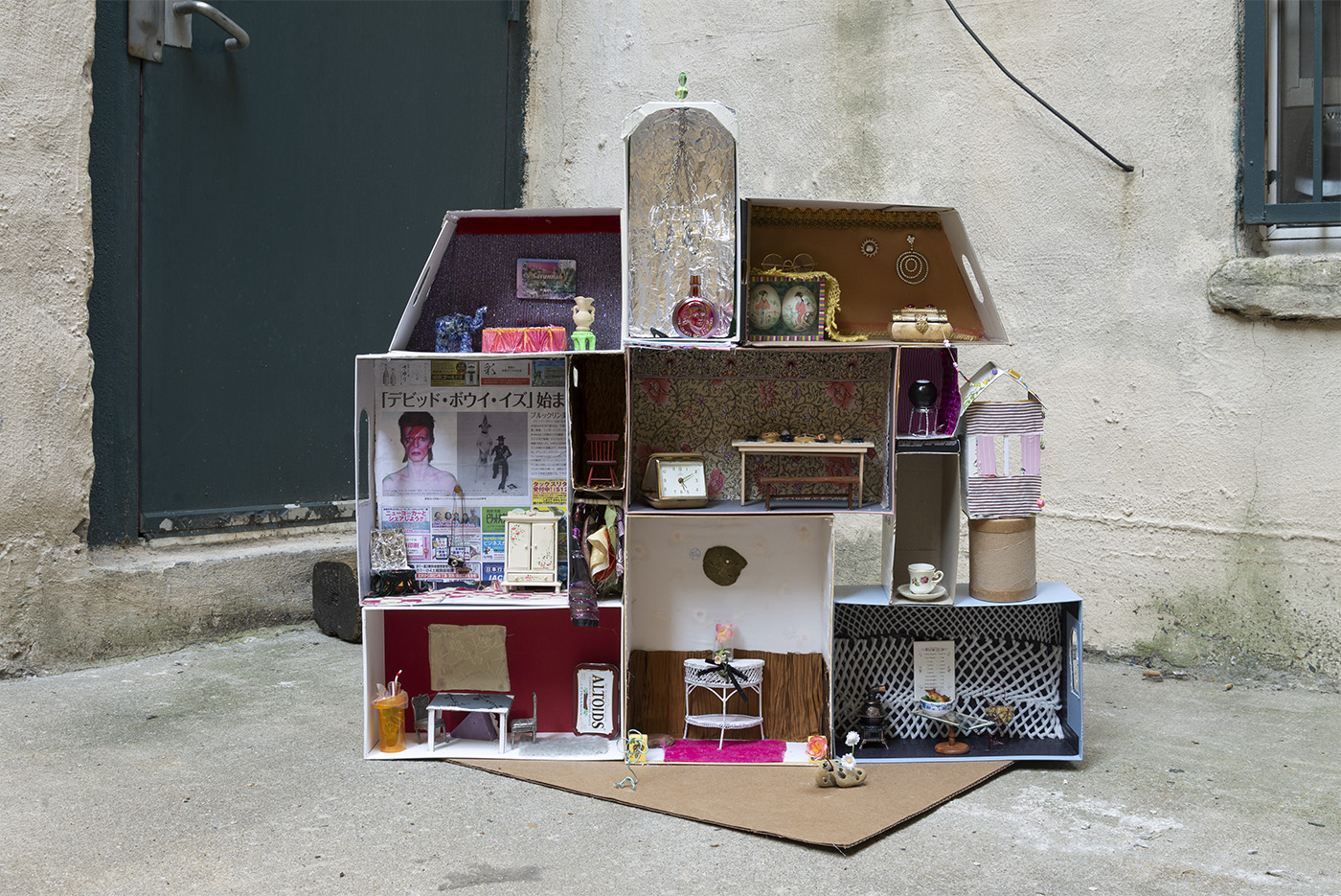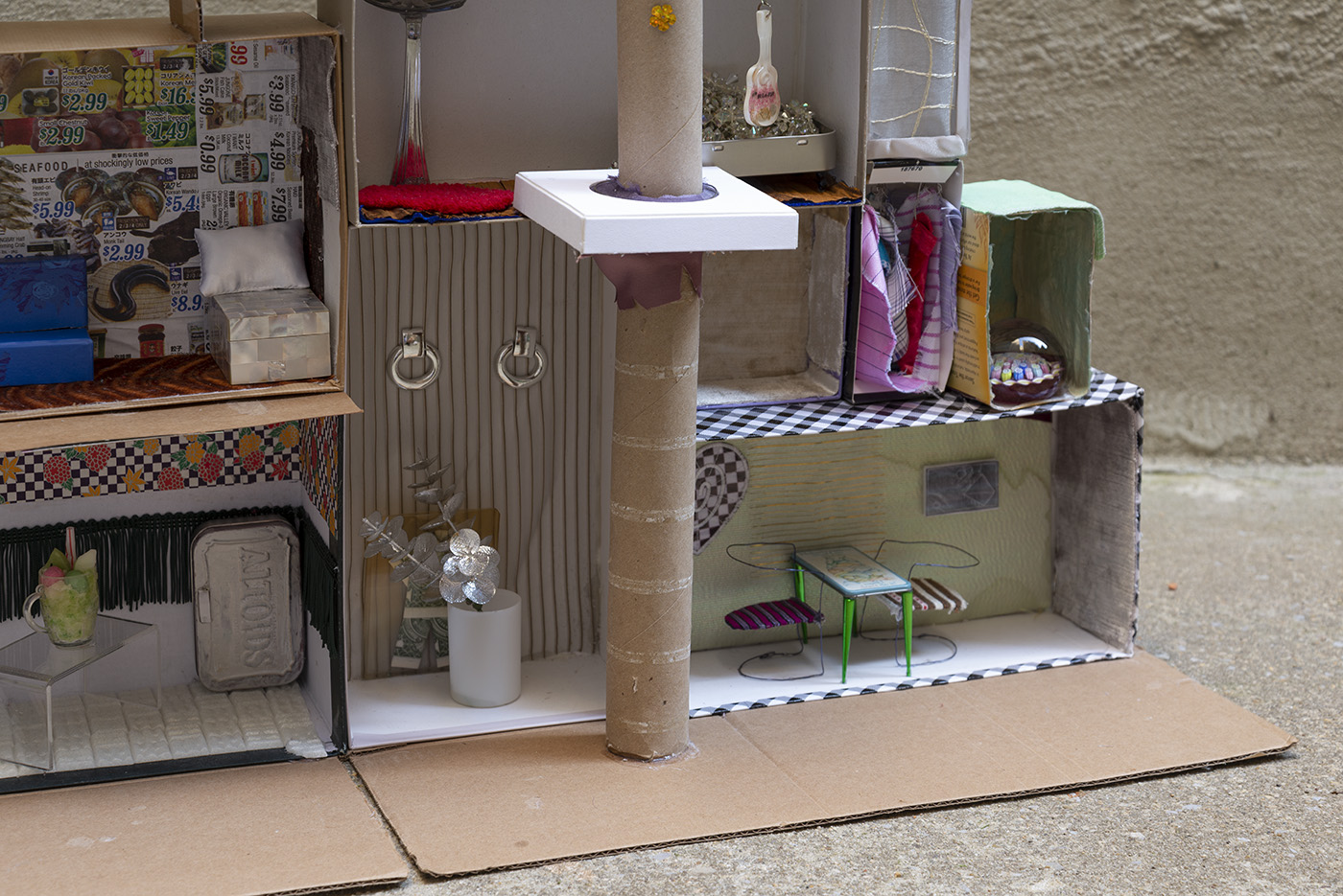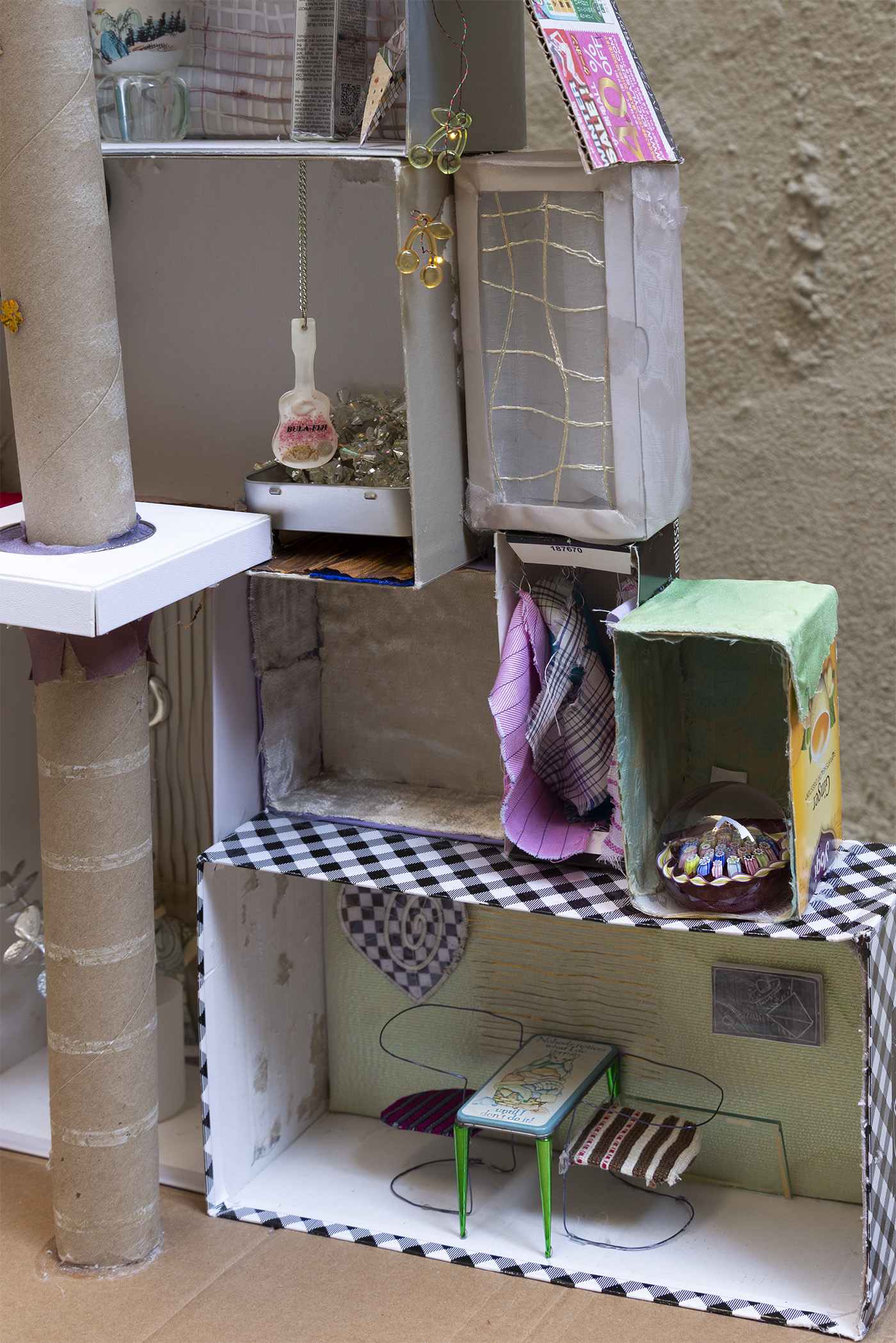 Paperboard, cardboard, various fabrics, newsprint, glass tile, paper stars, rhinestones, sequins, LED battery-powered light, plastic beads, Antique glass paperweight, vinyl patch, Japanese handpainted eggshell, Muji™ glass toothbrush stand, abalone boxes, John Deacons Scottish glass paperweight, resin Bula-Fiji guitar keychain, metal jar lid, plastic spoon, Altoids® tins, miniature ramen bowl, Sculpey, miniature smoothie cup, ornamental faux plant, silver earrings, US dollar bill origami, Urban Decay® by Skindinävia Chill Cooling & Hydrating Setting Spray bottle cap, wire, seashells, shoe-shape rod, antique cat humor magnet, acrylic, foam core